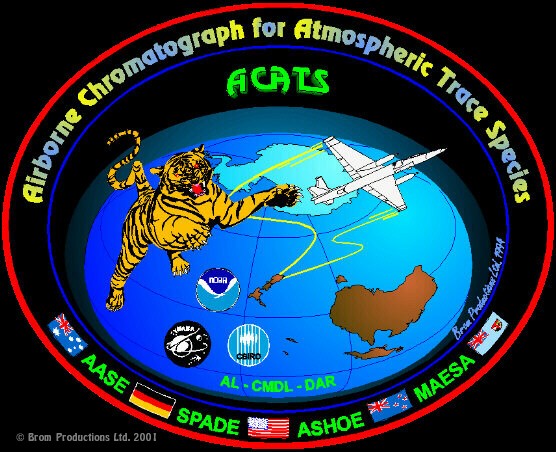 If you look at the content, you will notice that the tail of the tiger looks like an " a ", the tiger is a CAT, and the flight track of the airplane looks like an "S", together it forms A-CAT-S, get it? The mission went out of New Zealand and the ER-2 flew into the Antarctic ozone Vortex, that's why I decided to turn the earth upside-down and display the area of investigation. I'm sure that the Aussies and Kiwis didn't mind....ACATS, by the way, is the name of an instrument that was built in our laboratory at NOAA. Some more info on the mission: ACATS - the project.