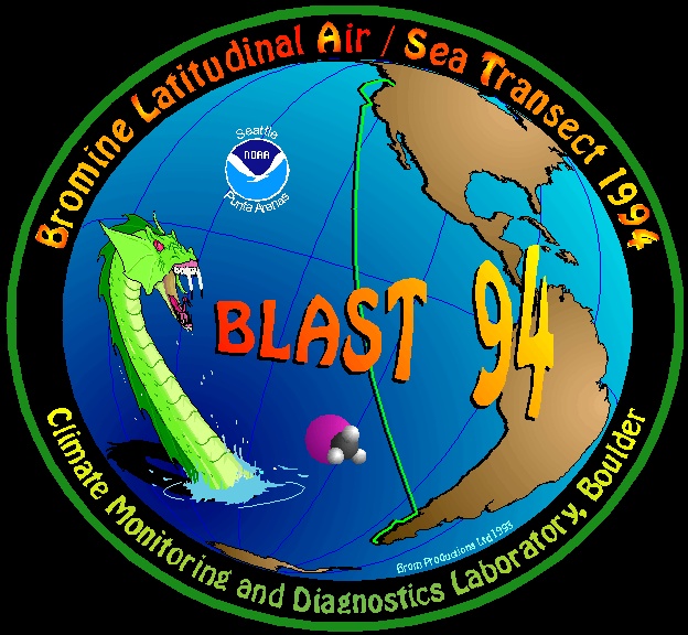 My second logo. It took almost two years to get started on it, but the intervals were meant to decrease rapidly. BLAST 94 was a cruise designed to measure methyl bromide, a bromine containing, ozone-depleting, natural compound, hence the name Bromine Latitudinal Air Sea Transect. I guess I left quite an impression when I (as a German and non-native speaker) came up with 18 different possible acronyms for this mission. Keeping my experience with the first cruise on the ship from hell in mind, I had such great names as Volatile Organic Methylbromide Interchange Transect (VOMIT) or the Bromine/Atmosphere Release Field experiment (BARF) or the Pacific Underway Knowledge Endeveavor (PUKE). But not all of them were this bad, the Sea/Air Interchange: a Latitudinal Oceanic Research program (SAILOR) was a strong contender along with the Bromine Ocean Atmosphere Transect (BOAT). We settled on "BLAST", because it has two more meanings besides the acronym: a wind blast and the fun blast that we actually ended up having.