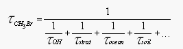 Based on the lifetime of 2.7 y for oceanic degradation from Yvon and Butler, [1996], a partial lifetime of 1.67 y for atmospheric removal including stratospheric losses [Prinn et al., 1995], we can calculate a total lifetime for atmospheric CH3Br of 1.03 y by adding the inverse single lifetimes according to eq. 10. This estimate is about half of the earlier used estimate of 1.8-2.1 y, which was based on atmospheric removal alone and an underestimate of the mean tropospheric OH concentration. Adding the results of Shorter et al. [1995] of 3.4 y for breakdown in soils, we estimate an even lower total lifetime of 0.8 y, with a possible range including all known uncertainties of 0.6 y to 1.3 y [Yvon and Butler, 1996].
