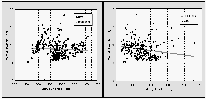 Singh et al. [1983] reported that CH3Br and CH3Cl were highly correlated in their samples. This apparent correlation has led to the assumption that one could predict CH3Br concentrations in the ocean by extrapolating from CH3Cl distributions [UNEP, 1992; Singh and Kanakidou, 1993]. Our data, however, show that there is little if any similarity of CH3Br with CH3Cl or CH3I in the surface waters (Fig. 12). Further, our findings of a sink for atmospheric CH3Br over most of the ocean where there is clearly a source of CH3Cl, suggest that the processes regulating these two compounds are different and that, to a first degree, a correlation of concentrations should not be expected. This is readily apparent when one considers the importance of displacement of Br in CH3Br by Cl-, a process that does not affect the concentration of CH3Cl.
