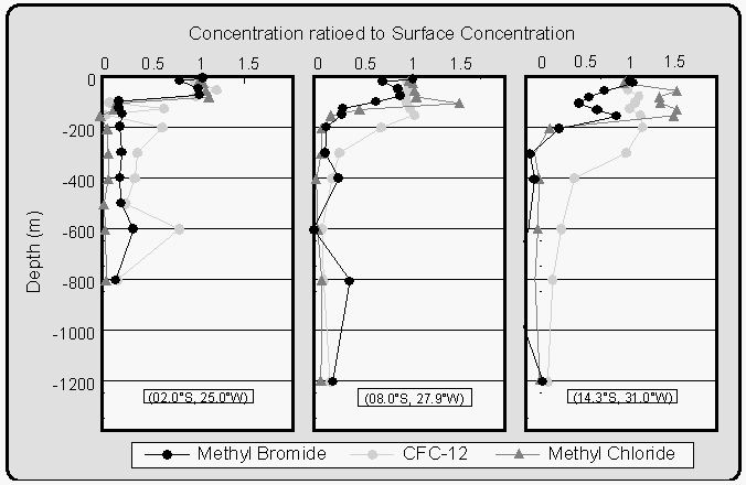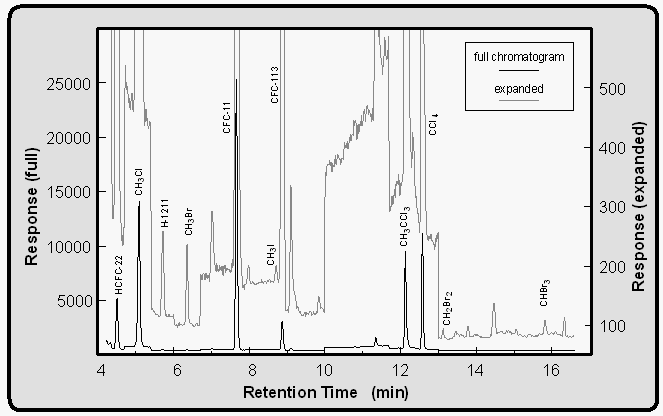 Measurements of gases other than CH3Br were necessary for this research. Gases that might be related in some way to the cycling of CH3Br (e.g., CH3Cl, CH3I) were obtained by GC/MS. We also needed information on advection and mixing in the ocean, for which some other gases are suitable tracers. The CFCs are conservative in seawater, i.e., under normal circumstances they do not react with seawater or any of its components and, hence, are good indicators for evaluating a variety of physical effects, such as those due to mixing or radiative heating. N2O is produced biologically at depth or in coastal sediments. It is present in surface waters only as a result of transport and mixing, hence is an excellent gas for identifying regions of upwelling or for defining the extent of coastal influence. Frequent measurements of 7 gases (Table 1) in the air and surface water were obtained with a custom-built, three channel electron capture gas chromatograph (GC/ECD). This system processes samples at 10 min intervals. The chromatography is isothermal with backflushed columns for high precision (0.2-2.0 %) analyses at short intervals [Lobert et al., 1995b, Elkins et al. 1996].