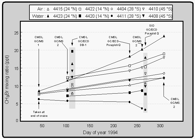 To resolve the question of which system was yielding correct results, we looked carefully at both analytical approaches. In this study, flasks that were collected during the cruises were analyzed with a GC/MS in Boulder, which had a sample inlet, trap, and column configuration different from the shipboard system [Montzka, 1993]. This reduced the possibility of artifacts that might have been associated with our shipboard GC/MS. ECD signals, however, can be enhanced by co-eluting peaks, which, by themselves, may or may not yield a response on the ECD. In fact, doping an analytical system with small amounts of O2 or N2O is a common practice now used to enhance the signals of certain molecules [Grimsrud and Miller 1978, Elkins et al., 1996]. CO2 and CH4 both yield virtually no response on an ECD, but they can greatly enhance the ECD response to N2O [Phillips et al., 1979; Crill et al., 1995]. With this in mind, we scanned some flask samples, both with the shipboard GC/MS and the flask GC/MS, and found numerous hydrocarbons eluting near or with the CH3Br peak. These hydrocarbons were found in very large quantities in air from the equilibrator, but not in ambient air samples. Although not conclusive, this does raise suspicion over GC/ECD analyses for CH3Br with a non-polar, methyl silicone-coated column.