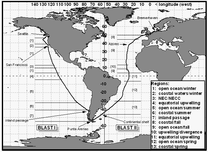 BLAST I started on 26 January 1994 out of Seattle, WA. The cruise track led offshore to Ocean Station P at about 44°N/130°W, returning into San Francisco for exchange of scientific personnel. From there, the ship took a great circle route to Ancud, Chile at 41°S, where it went into the inland passage of the Chilean west coast, a waterway between the mainland and numerous little islands (Figure 1). The waters of this narrow inland passage were brackish, influenced by continental fresh water inflow. The ship arrived in Chile, on 18 February 1994.