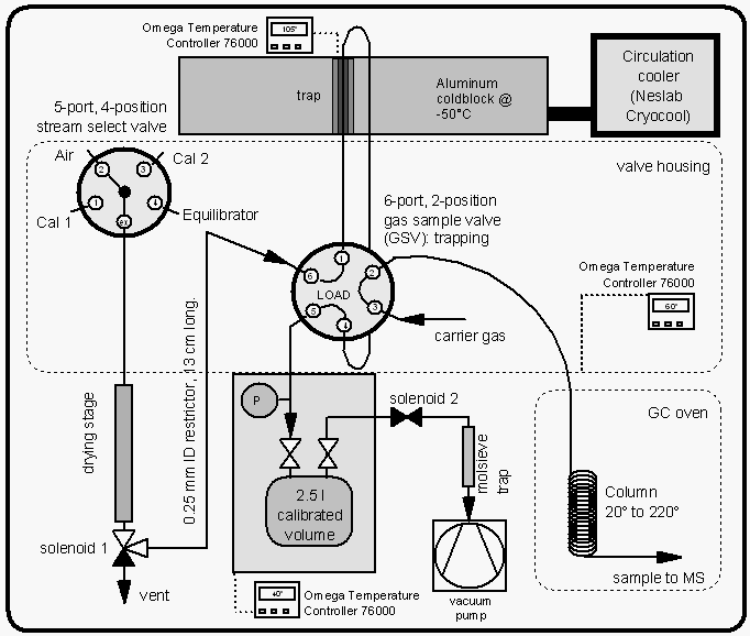 Our sampling approach allowed for frequent, automated, shipboard measurements of about 20 trace gases in the surface water and atmosphere with a gas chromatograph/mass spectrometer (GC/MS) (Table 1). Air for these measurements was sampled periodically from a continuous flow of 4-5 l min-1 from the bow; water was partitioned with a Weiss equilibrator [Weiss equilibrator] from which the circulating headspace was also sampled periodically [Butler et al., 1988, 1991a, Lobert et al., 1995b].