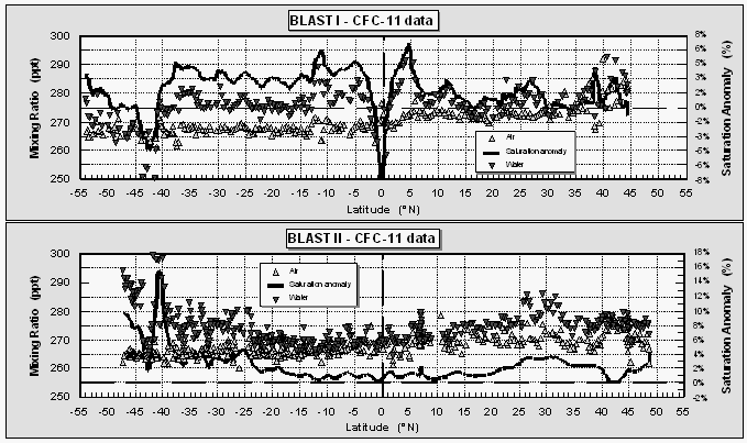 ABSTRACT 1. INTRODUCTION 2. THE CRUISES 2.1. BLAST I 2.2. BLAST II 3. METHODS 3.1. Mass Spectrometric Air and Surface Water Measurements 3.2. Measurements of Water Column Samples 3.3. Other Measurements 4. CALCULATIONS 4.1. Mole Fractions (Gravimetric Mixing Ratios) 4.2. Data Correction for Warming of the Equilibrator 4.3. Saturation Anomalies and Fluxes 4.4. Atmospheric Properties 4.5. Flux Terms 4.6. Lifetimes and Ozone Depletion Potential 5. RESULTS 5.1. Ancillary Data for Both Cruises 5.1.1. BLAST I 5.1.2. BLAST II 5.2. Air and Surface Water Measurements 5.2.1. CFC-11 5.2.2. Nitrous Oxide 5.2.3. Methyl Bromide 5.2.4. Other Methyl Halides 5.3. Subsurface Measurements During BLAST II 5.4. Flask Analyses 6. DISCUSSION 6.1. Discrepancies With Previous Studies 6.2. Relationships With CH3Cl and CH3I 6.3. Oceanic Sources and Sinks of Atmospheric CH3Br 6.4. Conclusions 7. REFERENCES 8. APPENDICES 8.1. List of Tables 8.2. List of Figures 8.3. Acknowledgments 8.4. Data