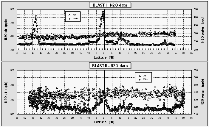 During BLAST II, samples from hydrocasts were analyzed for dissolved N2O by an automated headspace sampling technique and GC/ECD [Butler and Elkins, 1991b]. Samples were collected at depth in 1-10 l Niskin bottles attached to a rosette capable of bearing 12-36 bottles. Hydrography was recorded with a conductivity-temperature-depth sensor (CTD) mounted at the center of the rosette. On this cruise, 24 samples and references could be analyzed for N2O within three hours, allowing us to keep up with hydrocasts at one degree latitude intervals.