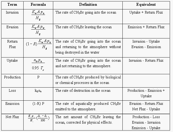 The large uncertainties in the air/sea exchange coefficient affect computation of both oceanic emissions and uptake of atmospheric CH3Br. Refining the estimate of this term can shorten the range of the lifetime estimate, but its greatest impact will be upon the estimate of oceanic emissions which are directly related to the exchange rate with the atmosphere. Thus, the error in Kw in this instance translates directly to the same relative error in oceanic emissions. Improvement in our understanding of the term will certainly enhance the ability to quantify the oceanic source.