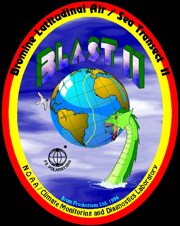 BLAST II followed pretty quickly after BLAST 94 and I didn't have a whole lot of time left to make logos. Fortunately, I could adapt the acronym, because the cruise was basically a repeat of BLAST 94 and I also gave Elsethea another appearance. Despite the time constraints, I think I still introduced quite a few innovative things into this logo. First of all, CorelDraw now had bitmap fractal fill patterns, which I used in both the background and the acronyms face (water and sky!). Then, I introduced a bit of pseudo-3D look by giving the earth a shiny face, which makes it appear standing out of the background. And lastly, we were required to have a special color code on all of our shipping boxes, the color code being red/yellow, visible on at least 3 sides of each crate. So, I thought why not combine the nice with the practical and give the logo a red/yellow border? We pasted our logo onto each side of the crates and were all set. Certainly no mix-ups here!